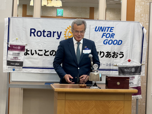 時田ガバナー、本日は誠にありがとうございました。私が初めて会長を務めさせていただいた際、最初の7月第一例会に、わざわざお越しいただき、力強い激励のお言葉を頂戴しましたこと、今でも鮮明に覚えており、深い感激と喜びが心に残っております。そして今回、改めてガバナーとしてお会いできましたこと、心より感謝申し上げます。本日の卓話では、我がクラブの課題や、クラブが今後さらに成長していくべきであるという貴重なお話をいただき、誠にありがとうございました。また、千葉県にゆかりのある「南総里見八犬伝の八徳」とロータリアンの精神との共鳴について、奉仕と楽しみの両面から活動されていることに、大変感銘を受けました。私たちもそのような機会に触れ、会員の皆様にもぜひ奨励してまいりたいと感じております。私がロータリークラブに入会して間もない頃、国際大会に参加する機会があり、エバンストンにある国際ロータリー本部を訪れました。ポール・ハリスが100年以上前に4人でロータリーを創設した「711号室」を再現した部屋があり、そこには小さな机と4つの椅子が並んでいました。その椅子に座り、記念写真を撮りました。現在、我がクラブの例会は少人数での開催となっておりますが、クラブの一人ひとりが、ポール・ハリスがロータリーを創設した時の想いと同じ気持ちで例会に臨んでおります。これからも、私たちの活動を大切に育ててまいりたいと思っておりますので、今後ともどうぞよろしくお願い申し上げます。